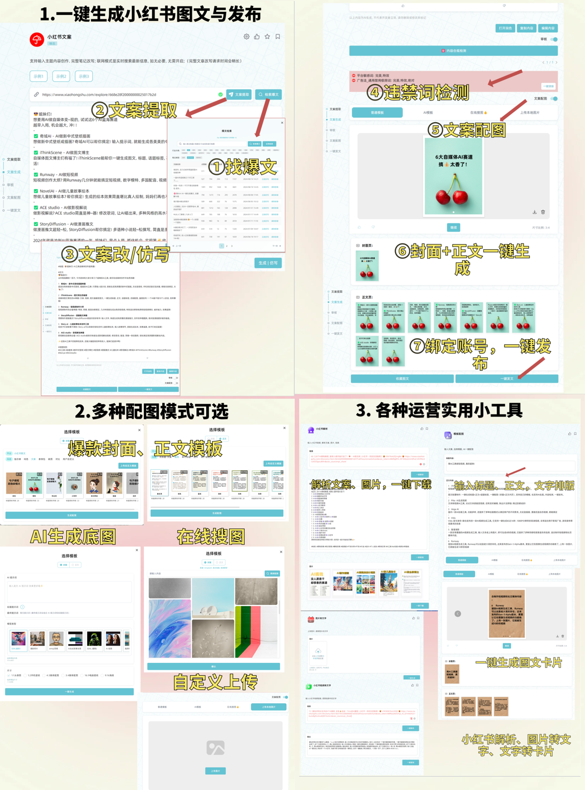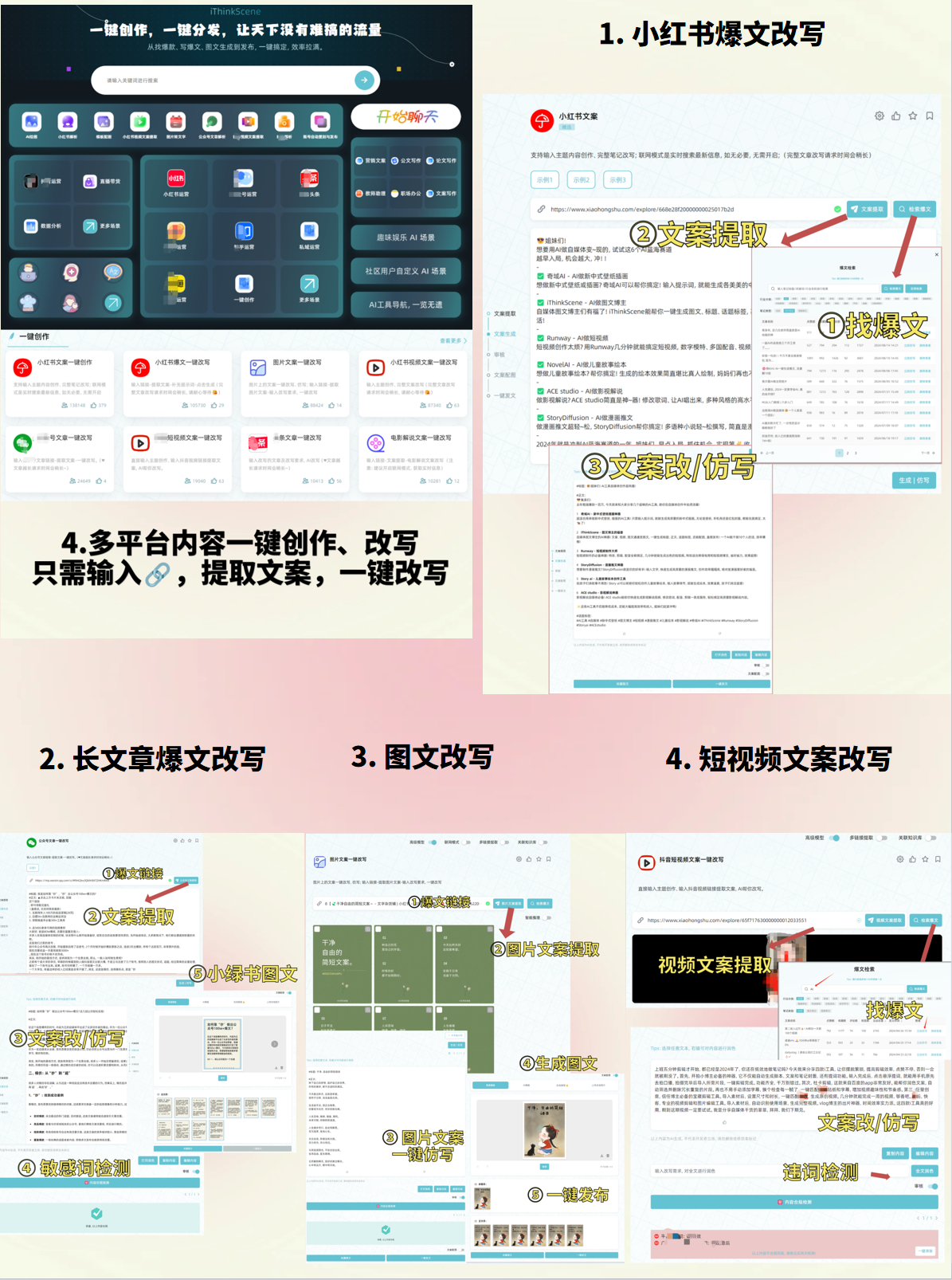 覆盖300+写作场景,适用于自媒体、电商等多个平台。输入主题和要求,轻松生成文案,支持批量生成和内容检测。自动复刻和定时发布,一站式服务(文案生成、内容检测以及图文制作)做自媒体轻轻松松~